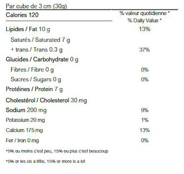 Lait pasteurisé, Sel, Présure, Chlorure de calcium, Culture bactérienne, Bière (orge, blé, avoine), Colorant caramel (sulfites), Extrait d’annatto (colorant)